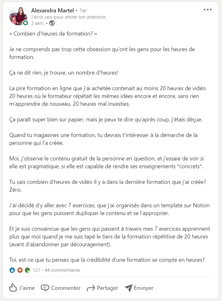 Comment savoir si cette approche fonctionne pour vous ? Lorsque vous mettez en place ce style d’écriture, vous pouvez vous fixer 2 KPI (Key Performance Indicator) : la lecture et les réactions, soit le nombre de vues et le taux d’engagement. Si vous améliorez ces deux paramètres, cela signifie que vous améliorez votre visibilité et, par effet domino, votre notoriété, votre unicité et vos ventes.
